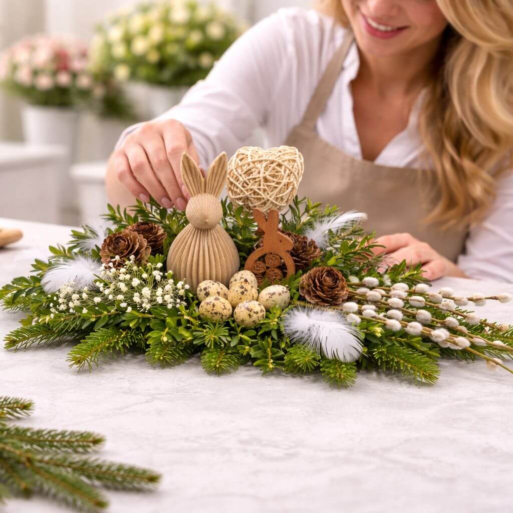 Każda kompozycja przygotowywana jest ręcznie, z dużą dbałością o proporcje, dobór dodatków i ogólną estetykę. Dzięki temu każdy stroik ma indywidualny charakter, a całość zachowuje spójny i elegancki wygląd. Ręczne wykonanie pozwala również starannie dopracować detale tak, aby produkt dobrze wpisywał się w charakter sezonowych dekoracji nagrobnych na Wielkanoc.