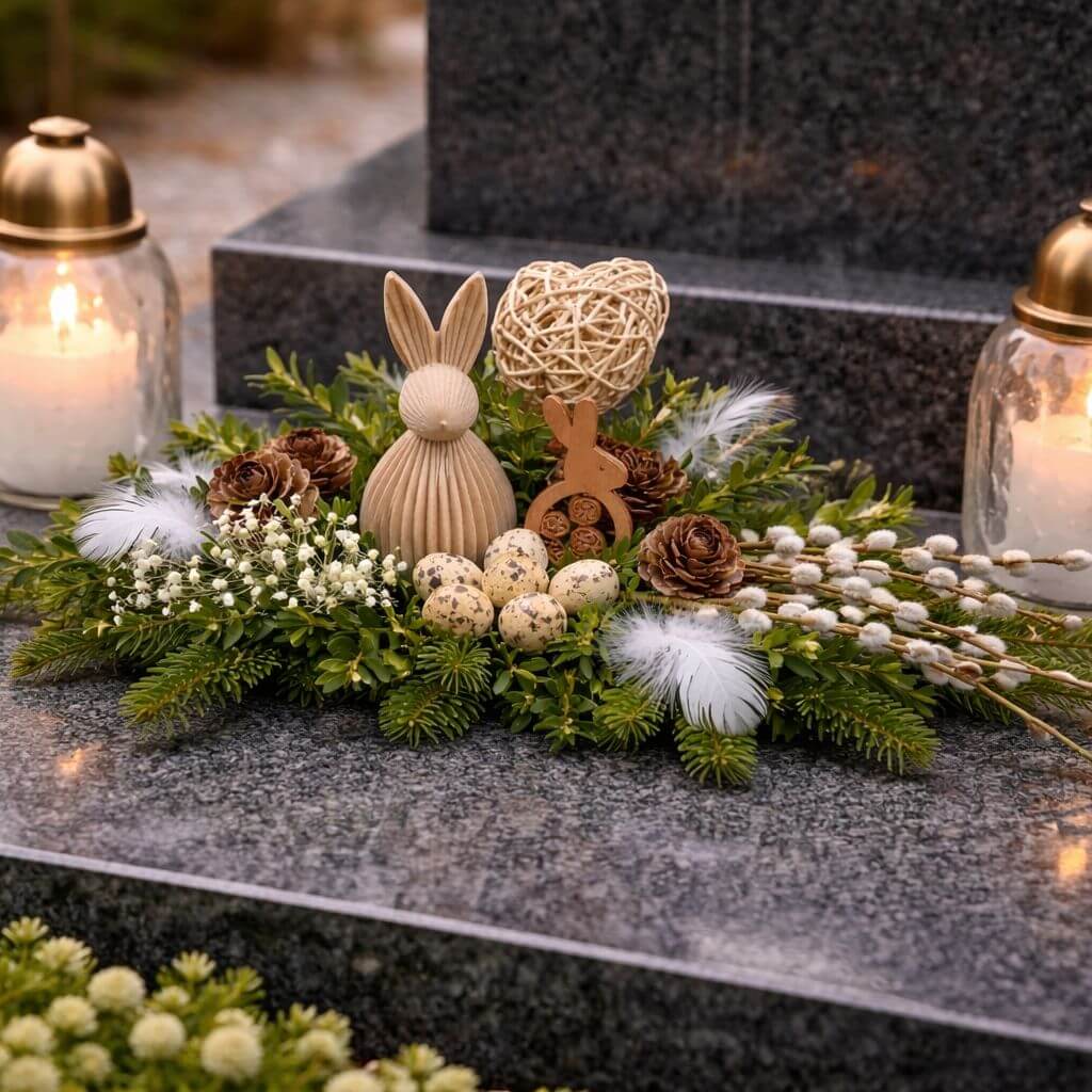 To propozycja dla osób, które szukają dekoracji subtelnej, trwałej i dobrze dopasowanej do miejsca pamięci. Stroik wielkanocny na cmentarz w tej formie podkreśla świąteczny charakter Wielkanocy, a jednocześnie zachowuje odpowiednią powściągliwość i szacunek dla otoczenia.
