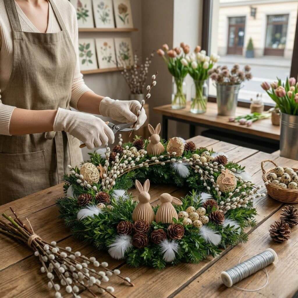 Każda kompozycja przygotowywana jest ręcznie, z dużą dbałością o proporcje, dobór dodatków i ogólną estetykę. Dzięki temu każdy wianek ma indywidualny charakter, a całość zachowuje spójny i elegancki wygląd. Ręczne wykonanie pozwala również starannie dopracować detale tak, aby produkt dobrze wpisywał się w charakter sezonowych dekoracji nagrobnych na Wielkanoc.