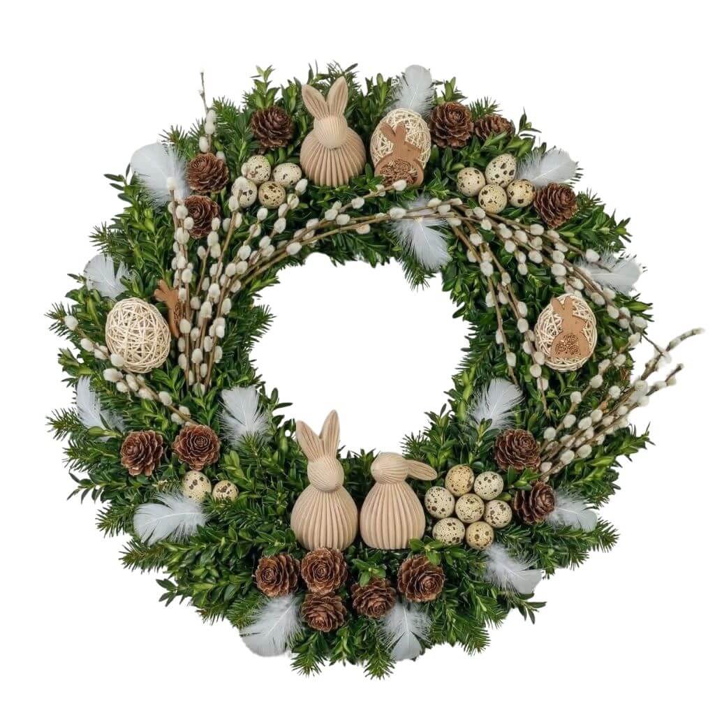 Prezentowany produkt został wykonany w formie okrągłego wianka wielkanocnego na grób, który dobrze prezentuje się jako samodzielna dekoracja sezonowa. Kompozycję tworzą sztuczna zieleń, bazie, dekoracyjne jajeczka, zajączki, piórka oraz szyszki, dzięki czemu całość zyskuje naturalny, wiosenny i świąteczny charakter. Zestawienie zieleni, bieli, beżu i brązu sprawia, że dekoracja wygląda elegancko, spokojnie i estetycznie.