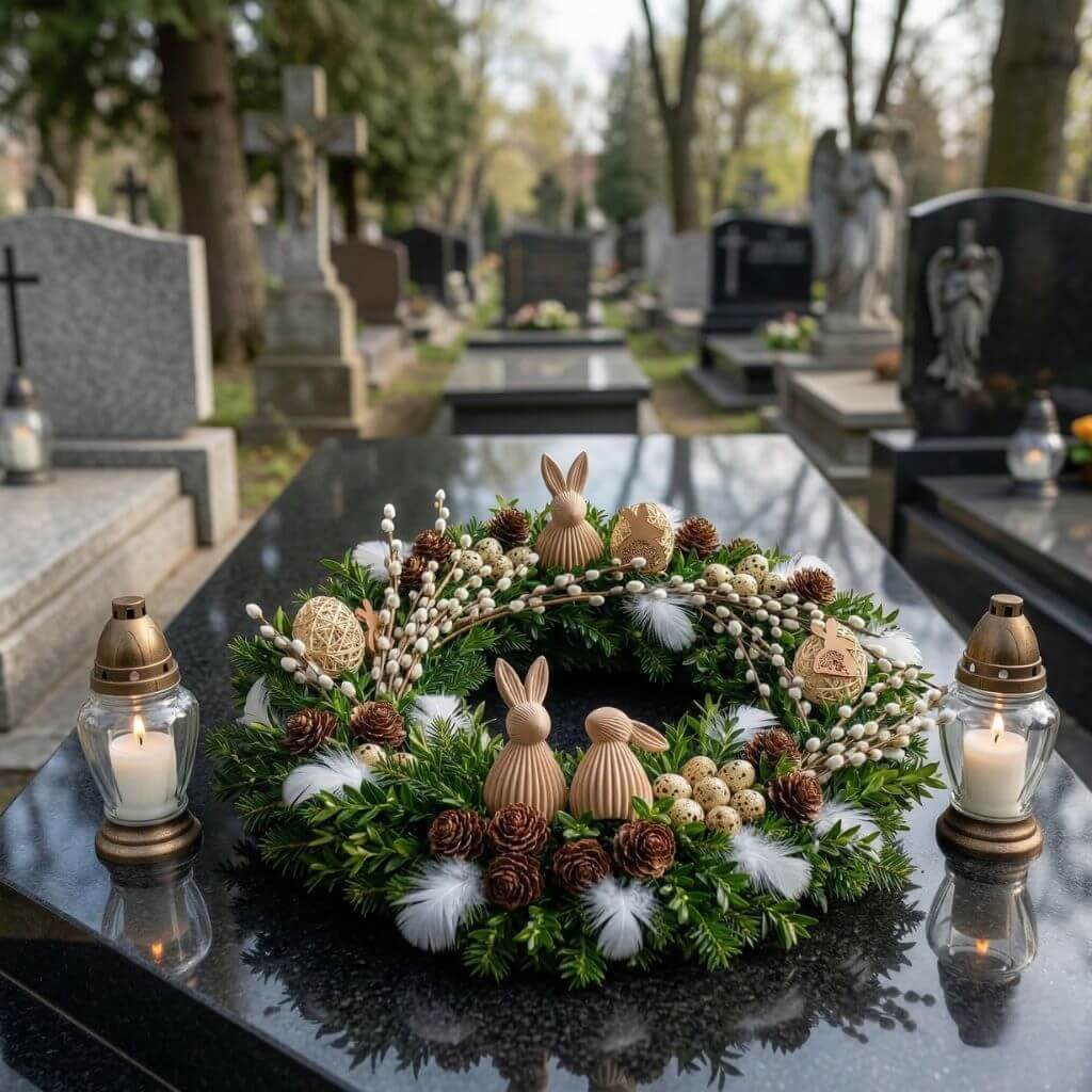 To propozycja dla osób, które szukają ozdoby subtelnej, trwałej i dobrze dopasowanej do miejsca pamięci. Wianek wielkanocny na cmentarz w tej formie podkreśla świąteczny charakter Wielkanocy, a jednocześnie zachowuje odpowiednią powściągliwość i szacunek dla otoczenia.